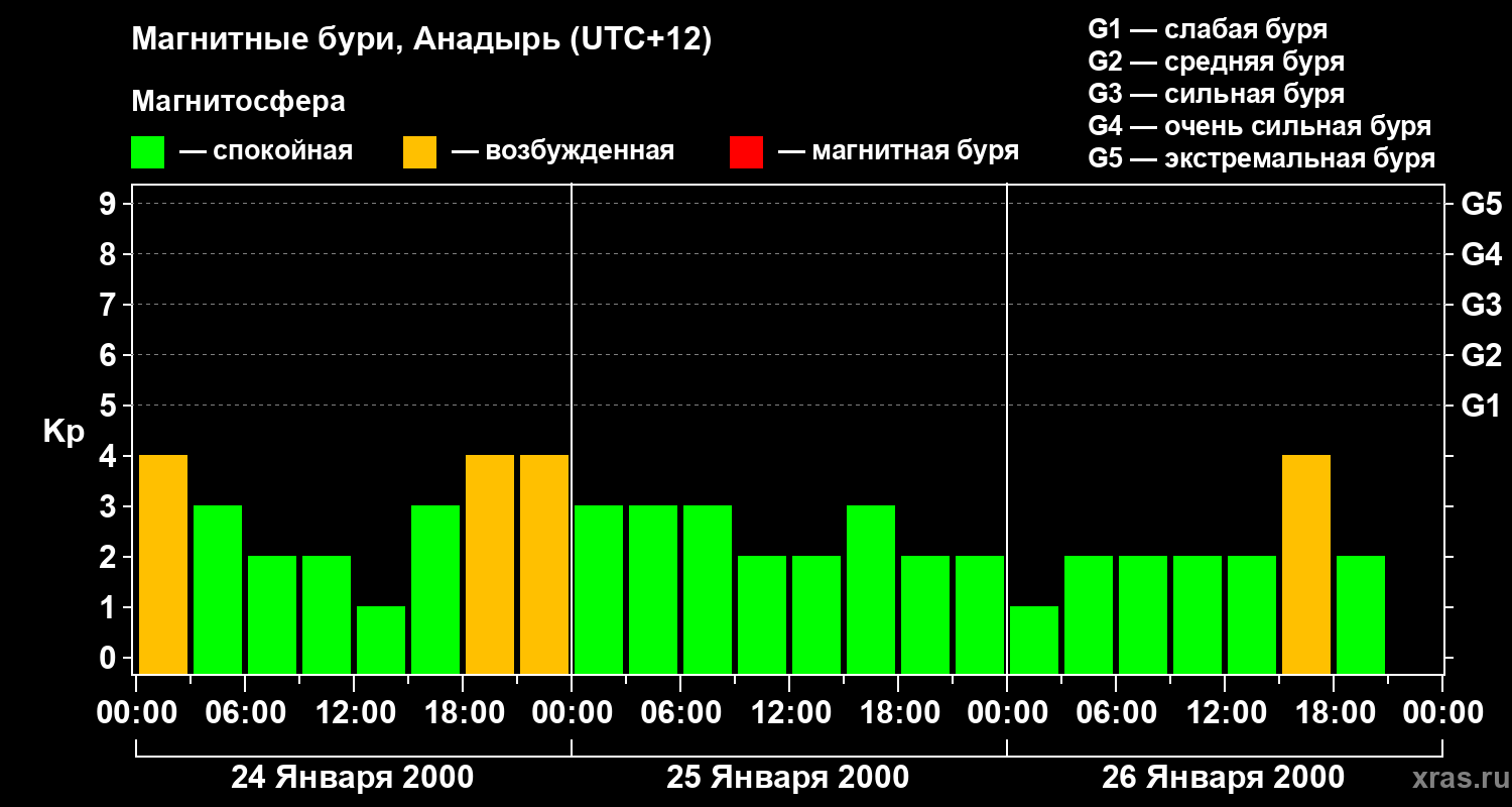Изменения геомагнитного индекса Kp с 24 по 26 января 2000 года для средних широт
