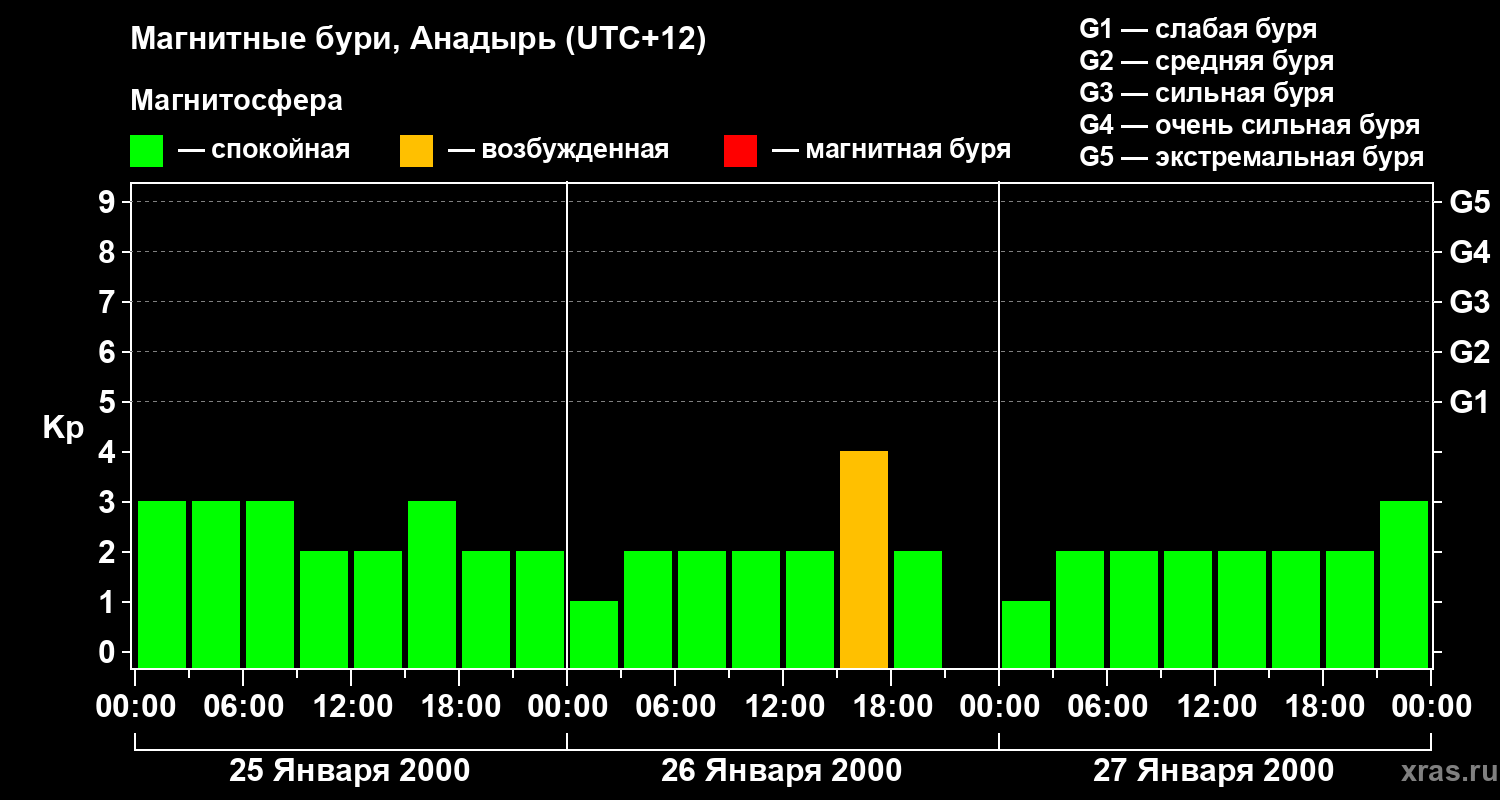 Изменения геомагнитного индекса Kp с 25 по 27 января 2000 года для средних широт
