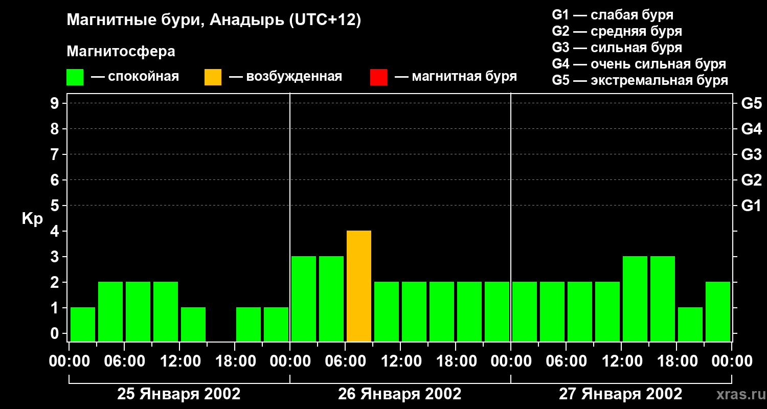 Изменения геомагнитного индекса Kp с 25 по 27 января 2002 года для средних широт
