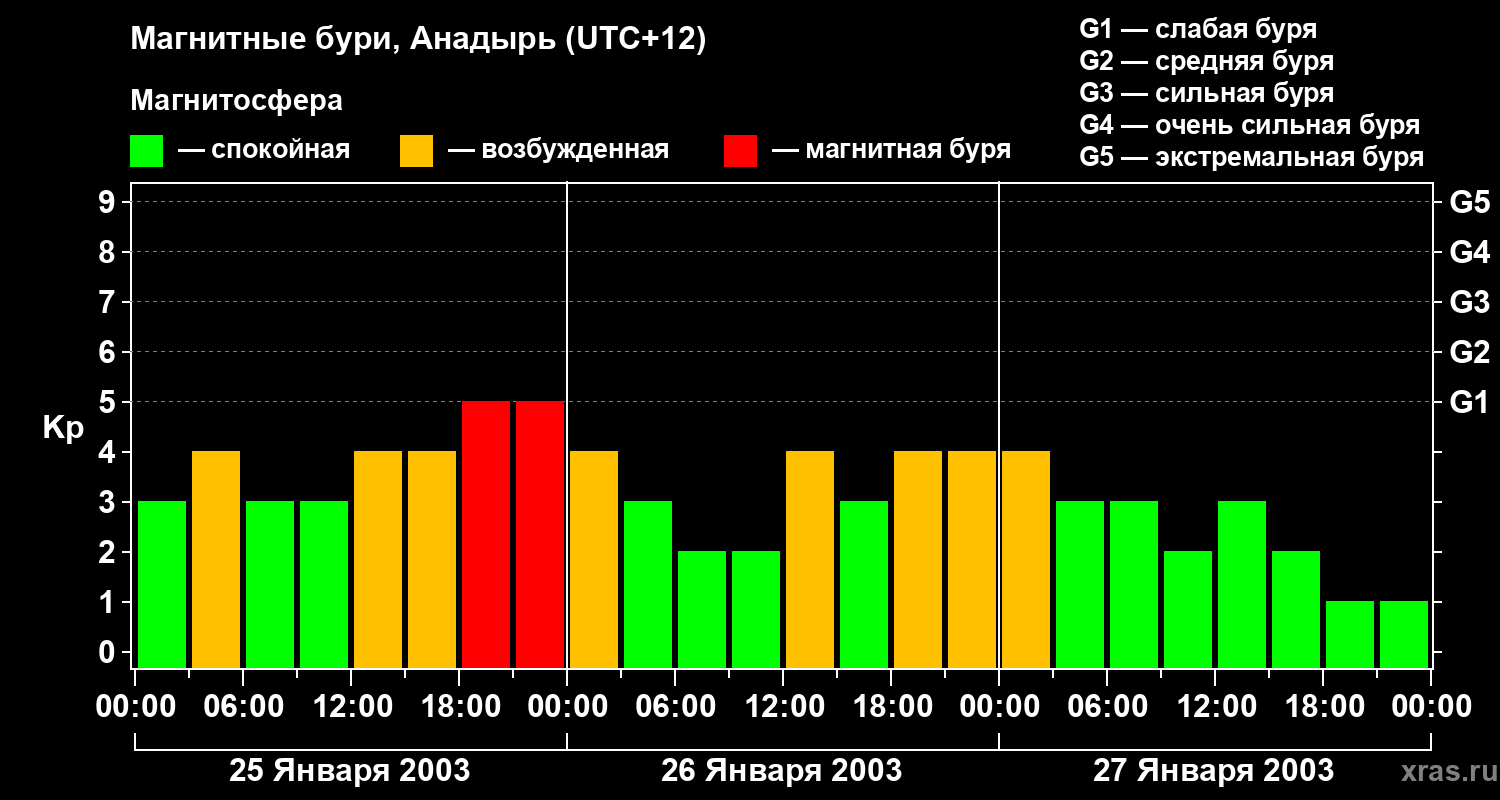 Изменения геомагнитного индекса Kp с 25 по 27 января 2003 года для средних широт