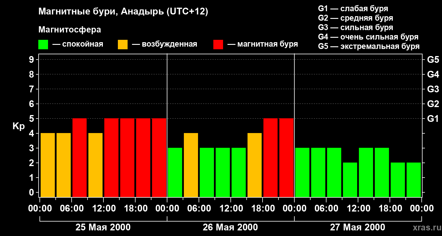 Изменения геомагнитного индекса Kp с 25 по 27 мая 2000 года для средних широт