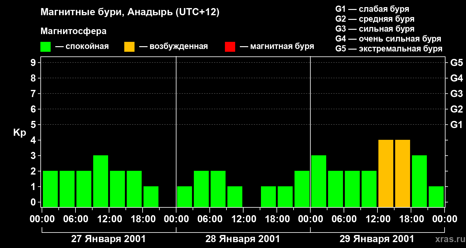 Изменения геомагнитного индекса Kp с 27 по 29 января 2001 года для средних широт