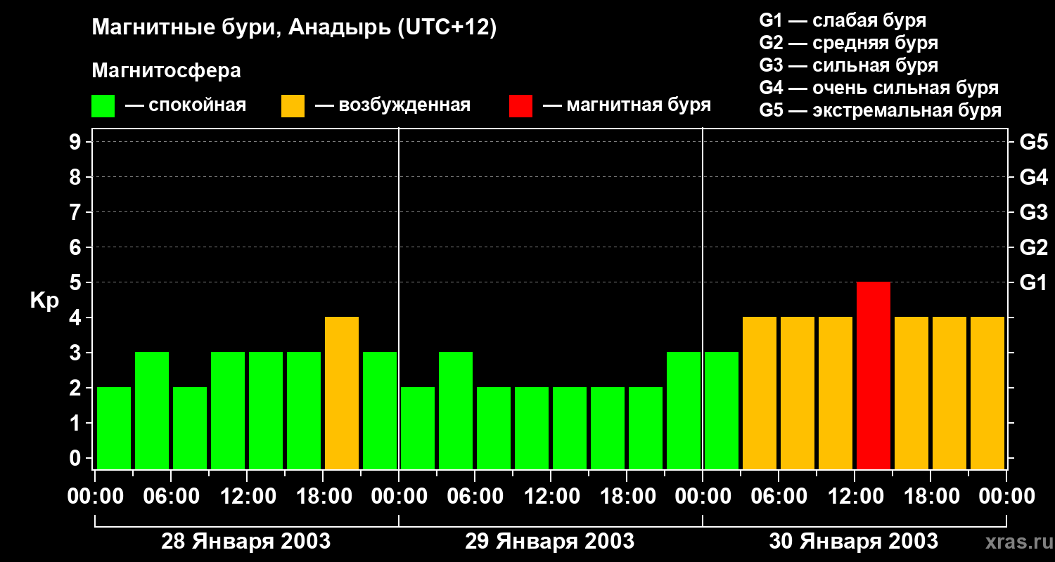 Изменения геомагнитного индекса Kp с 28 по 30 января 2003 года для средних широт