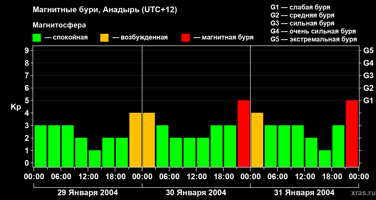 Изменения геомагнитного индекса Kp с 29 по 31 января 2004 года для средних широт