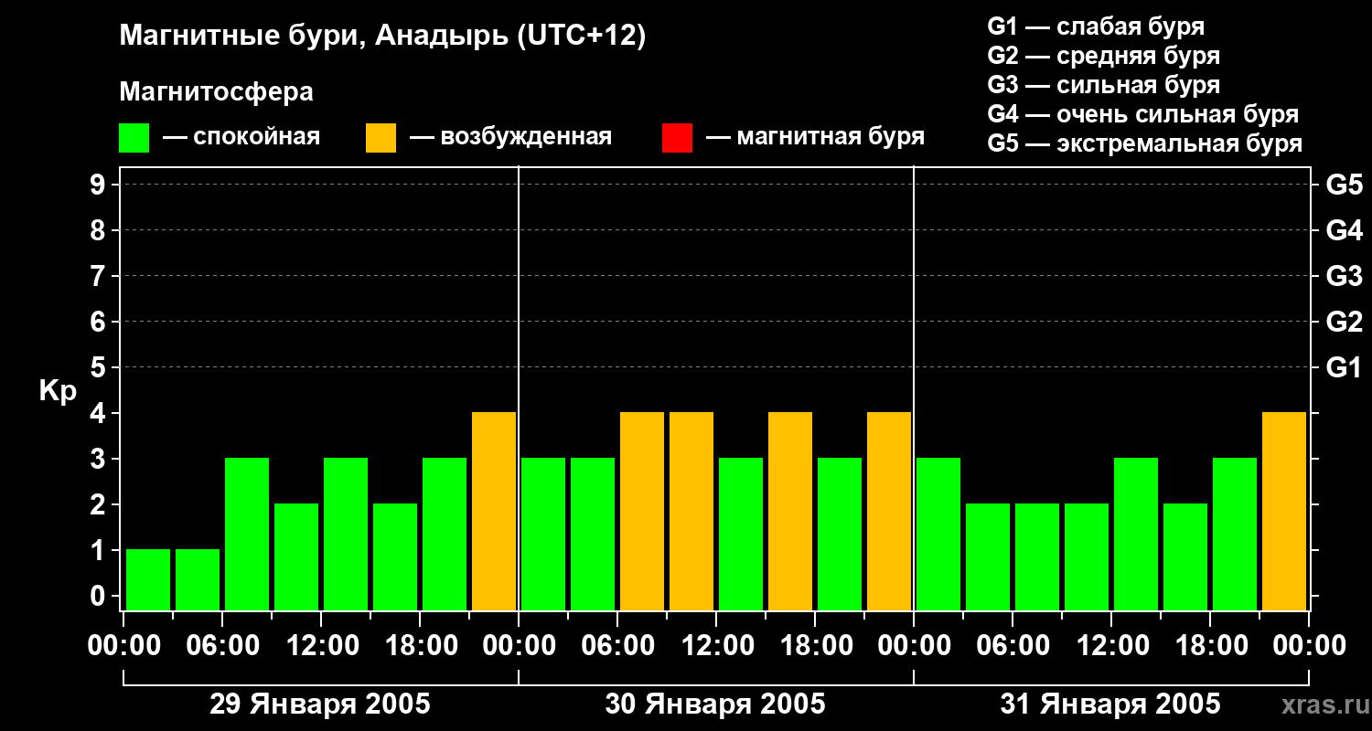 Изменения геомагнитного индекса Kp с 29 по 31 января 2005 года для средних широт