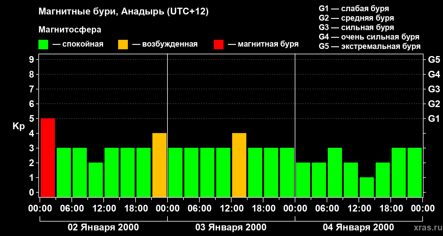 Изменения геомагнитного индекса Kp с 2 по 4 января 2000 года для средних широт