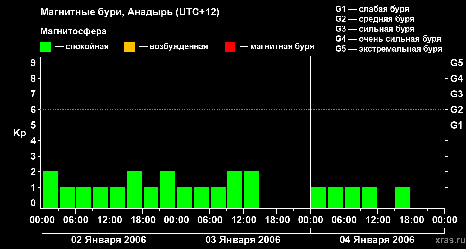 Изменения геомагнитного индекса Kp с 2 по 4 января 2006 года для средних широт