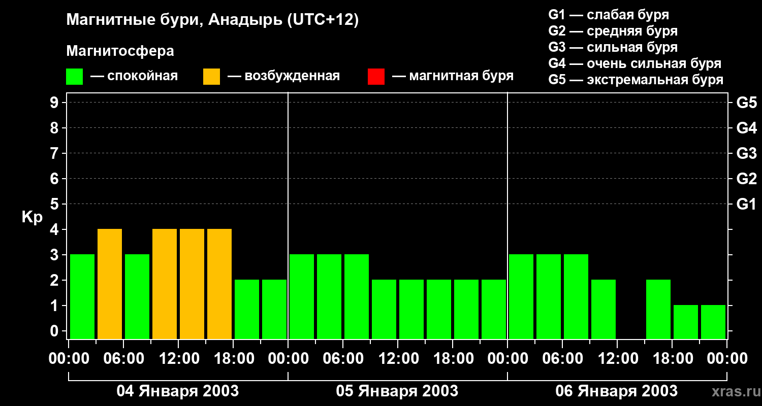 Изменения геомагнитного индекса Kp с 4 по 6 января 2003 года для средних широт