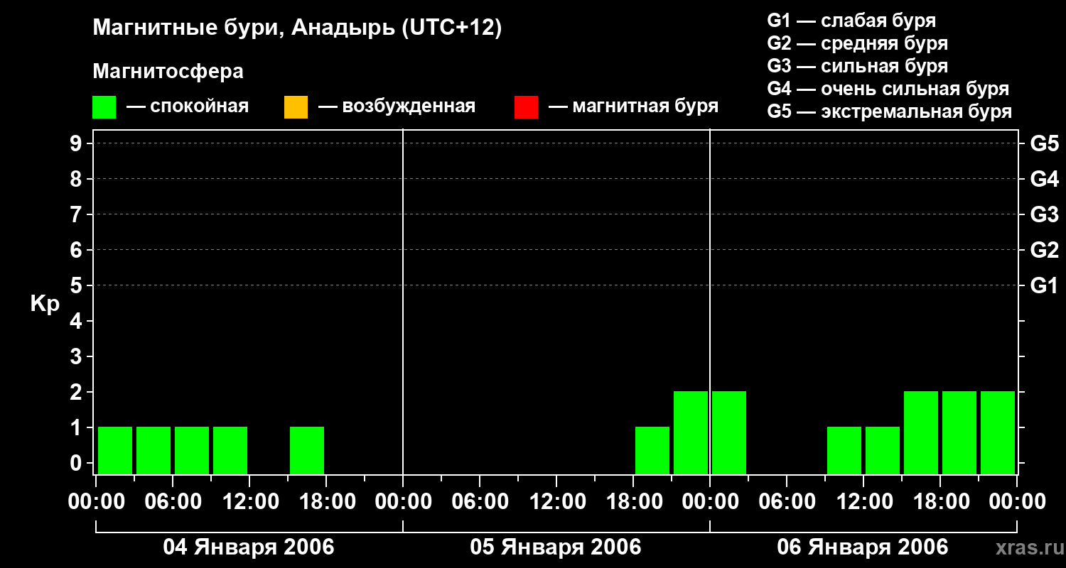 Изменения геомагнитного индекса Kp с 4 по 6 января 2006 года для средних широт