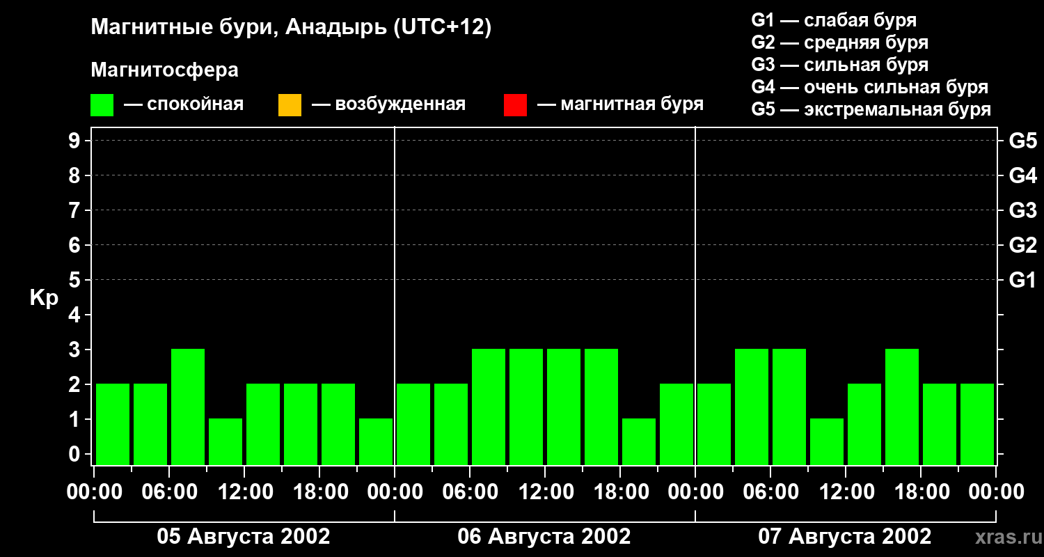 Изменения геомагнитного индекса Kp с 5 по 7 августа 2002 года для средних широт