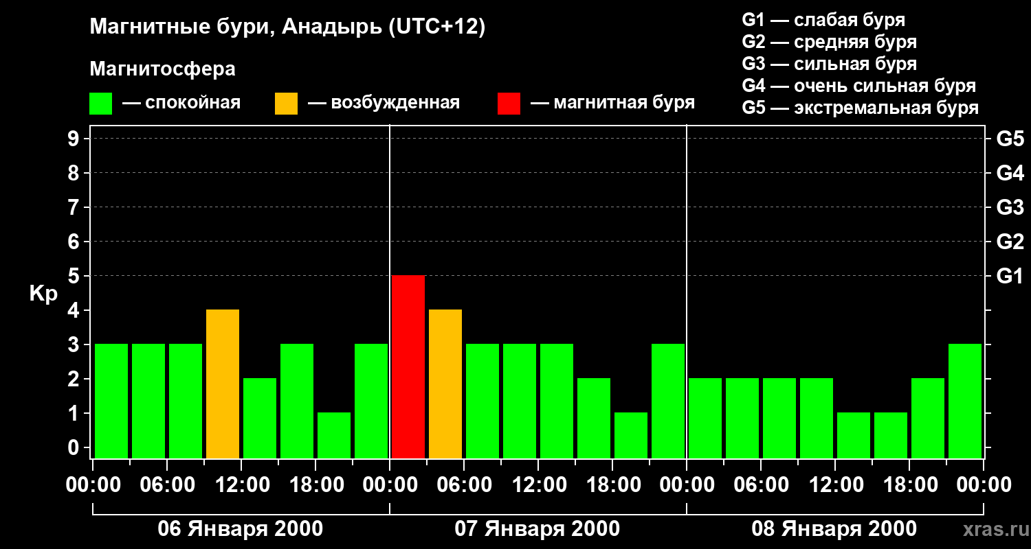 Изменения геомагнитного индекса Kp с 6 по 8 января 2000 года для средних широт