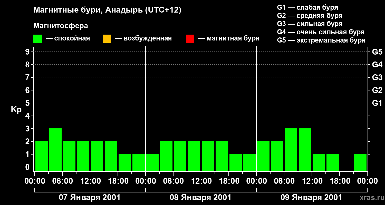 Изменения геомагнитного индекса Kp с 7 по 9 января 2001 года для средних широт