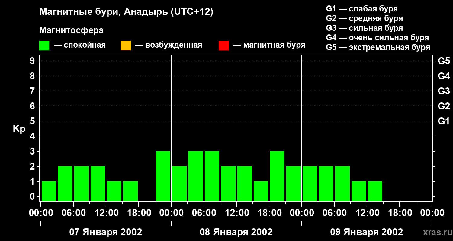 Изменения геомагнитного индекса Kp с 7 по 9 января 2002 года для средних широт