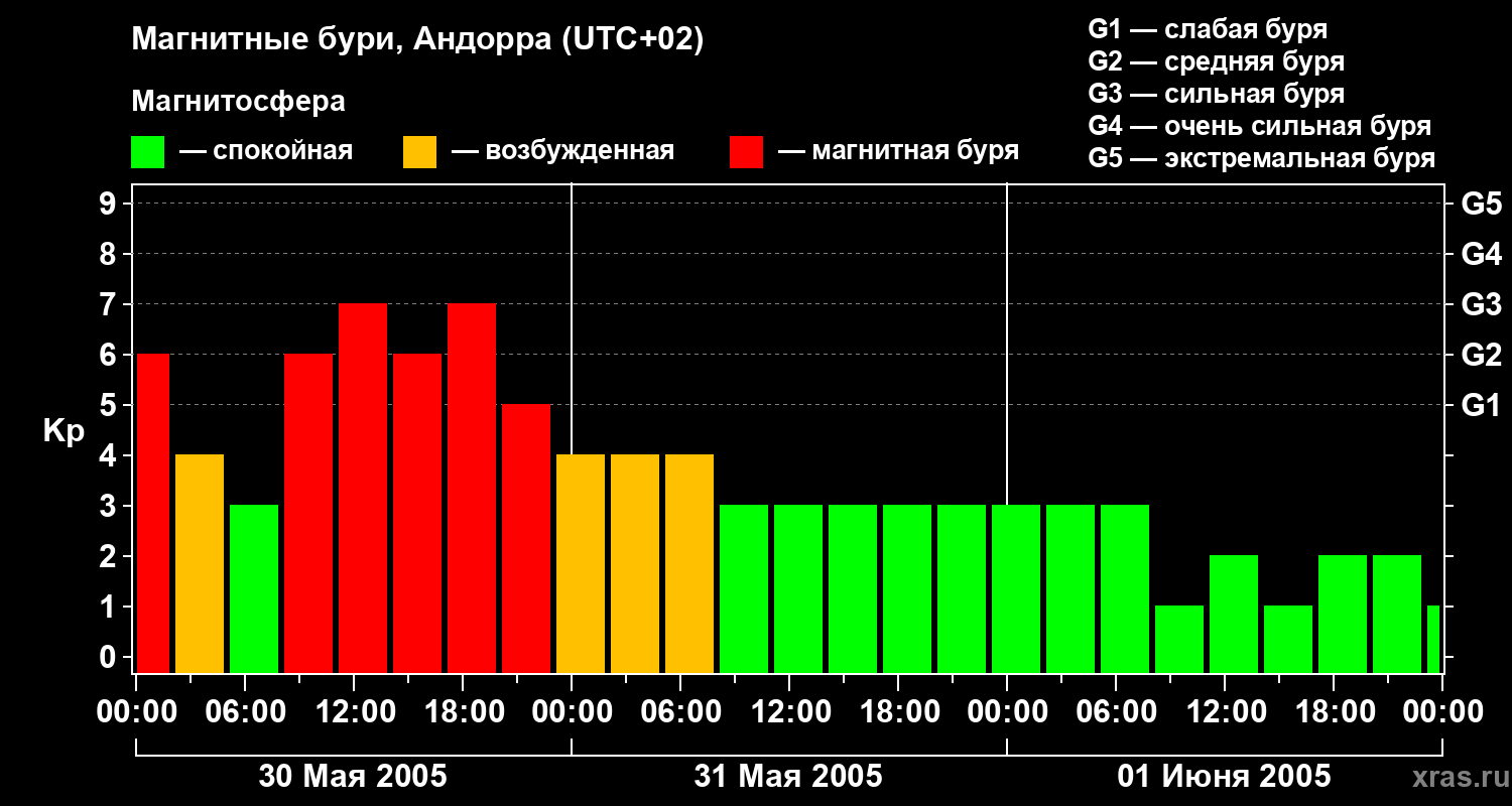 Изменения геомагнитного индекса Kp с 30 мая по 1 июня 2005 года для средних широт
