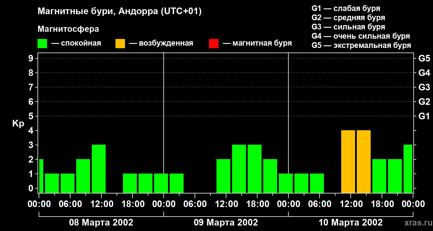 Изменения геомагнитного индекса Kp с 8 по 10 марта 2002 года для средних широт