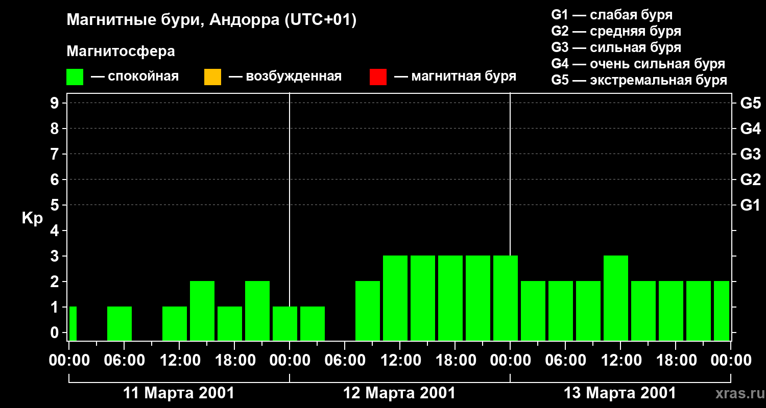 Изменения геомагнитного индекса Kp с 11 по 13 марта 2001 года для средних широт