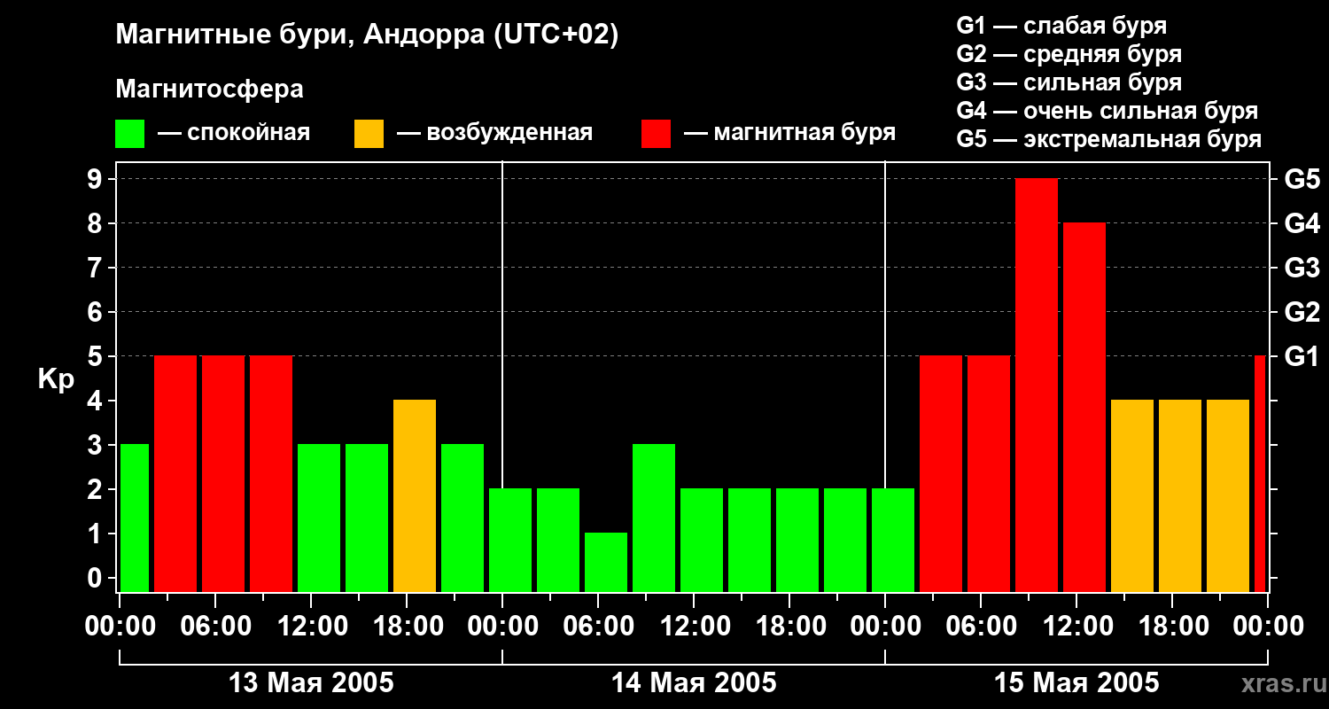 Изменения геомагнитного индекса Kp с 13 по 15 мая 2005 года для средних широт