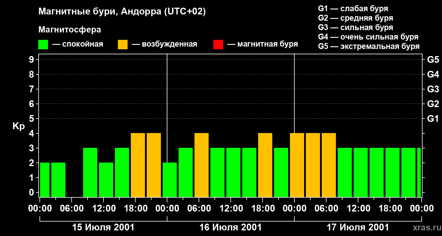 Изменения геомагнитного индекса Kp с 15 по 17 июля 2001 года для средних широт