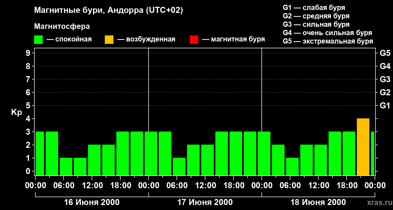 Изменения геомагнитного индекса Kp с 16 по 18 июня 2000 года для средних широт