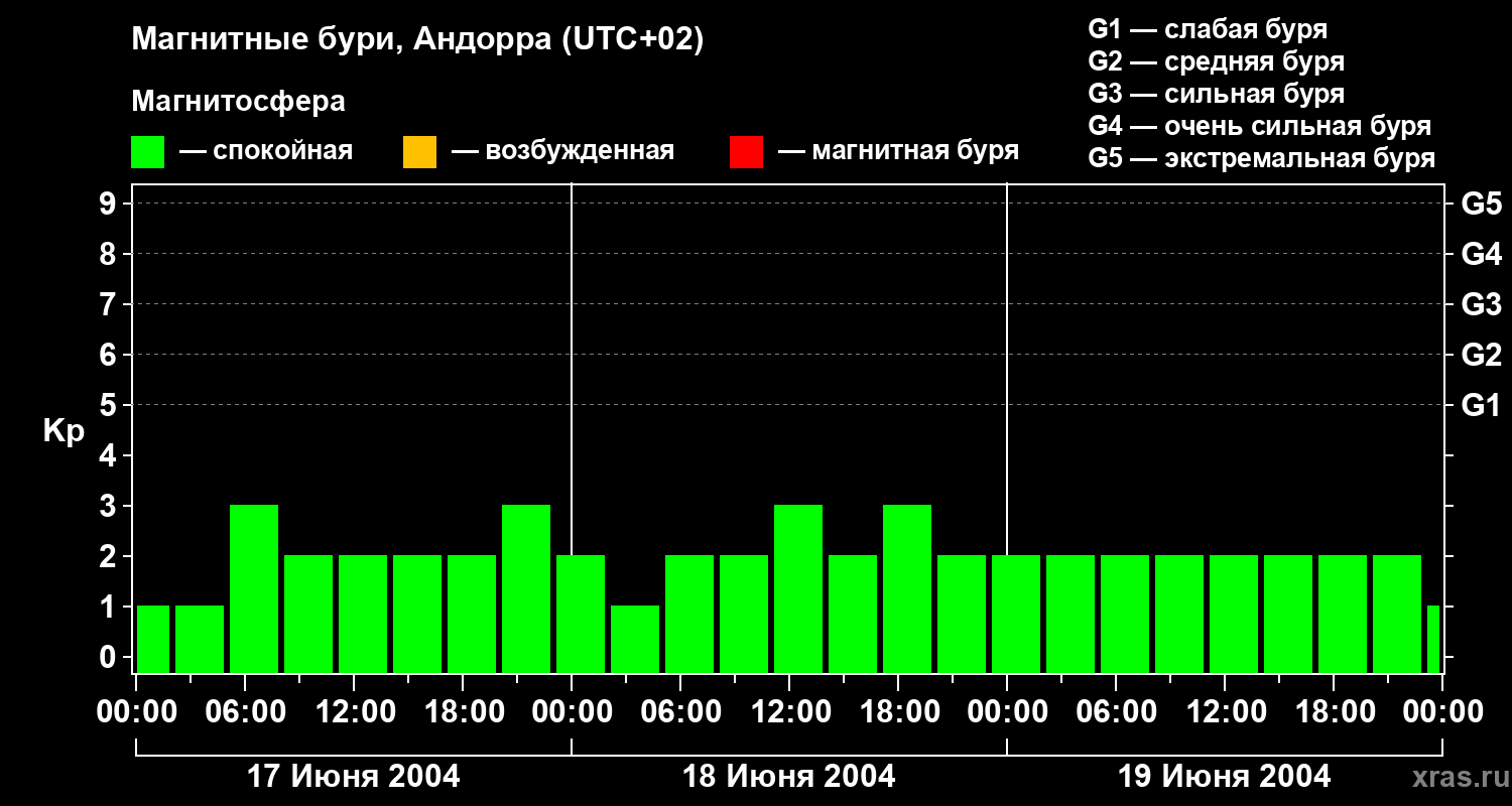 Изменения геомагнитного индекса Kp с 17 по 19 июня 2004 года для средних широт