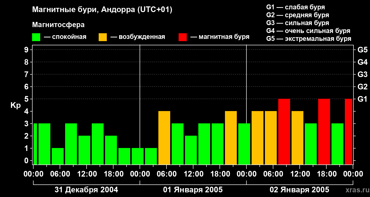 Изменения геомагнитного индекса Kp с 31 декабря 2004 года по 2 января 2005 года для средних широт