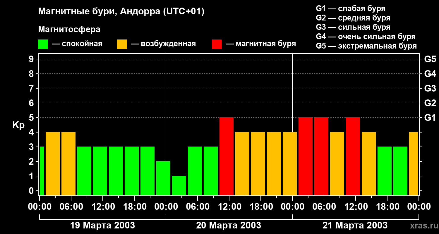 Изменения геомагнитного индекса Kp с 19 по 21 марта 2003 года для средних широт