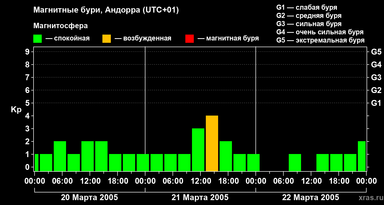 Изменения геомагнитного индекса Kp с 20 по 22 марта 2005 года для средних широт