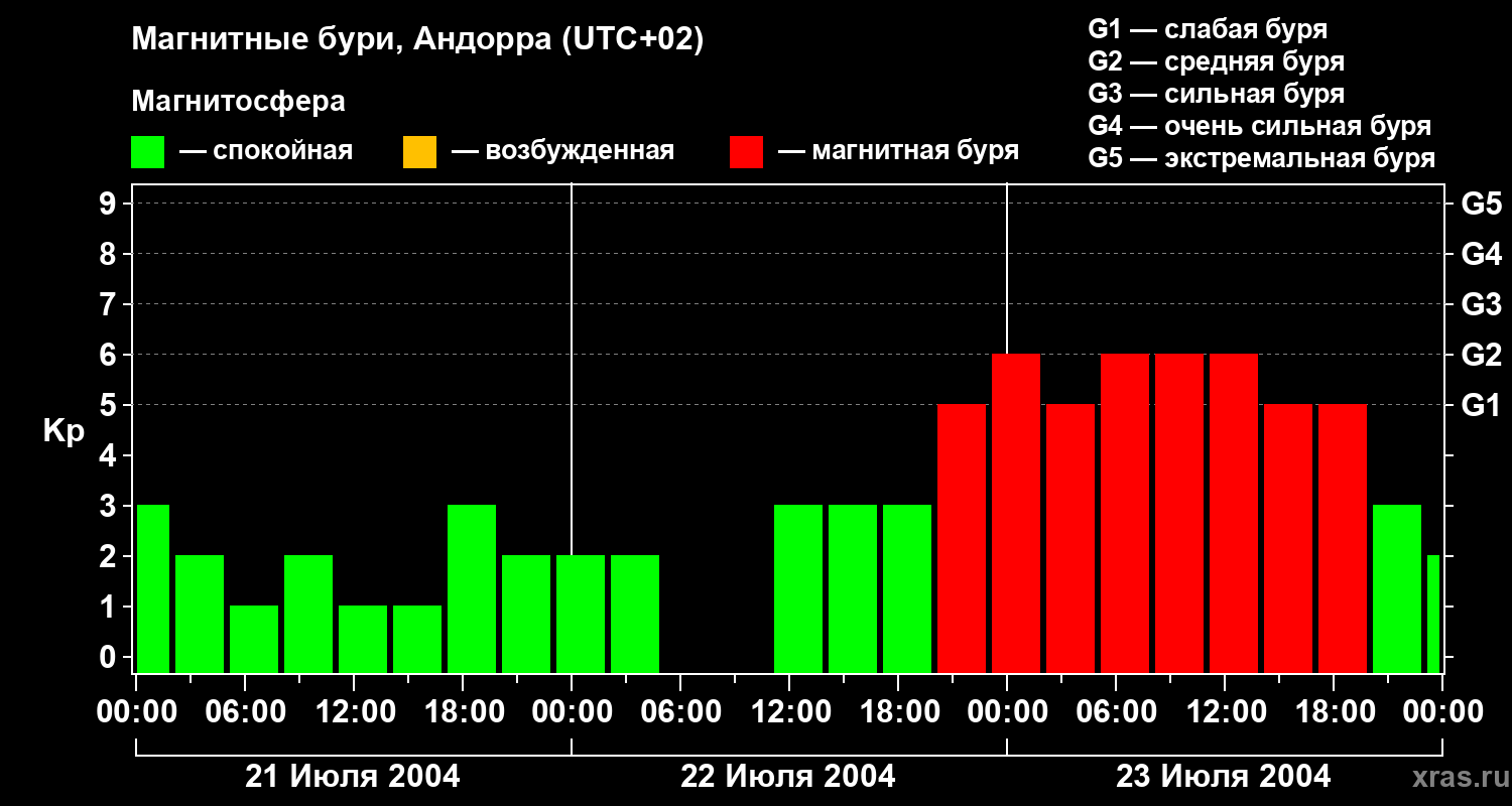 Изменения геомагнитного индекса Kp с 21 по 23 июля 2004 года для средних широт