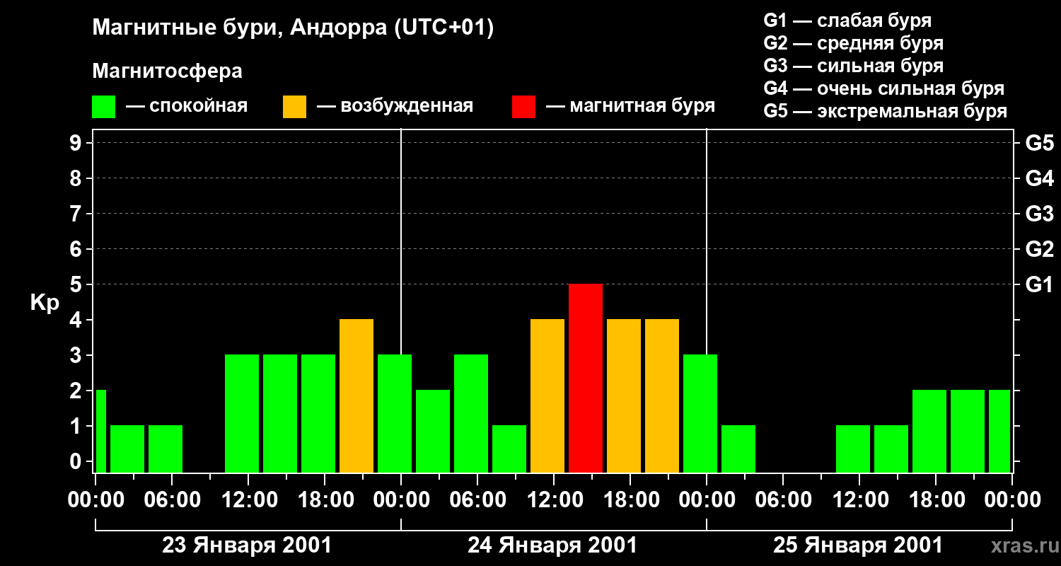 Изменения геомагнитного индекса Kp с 23 по 25 января 2001 года для средних широт