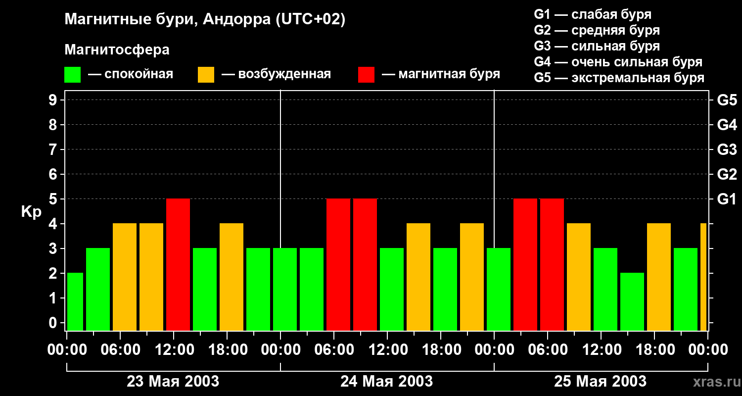 Изменения геомагнитного индекса Kp с 23 по 25 мая 2003 года для средних широт