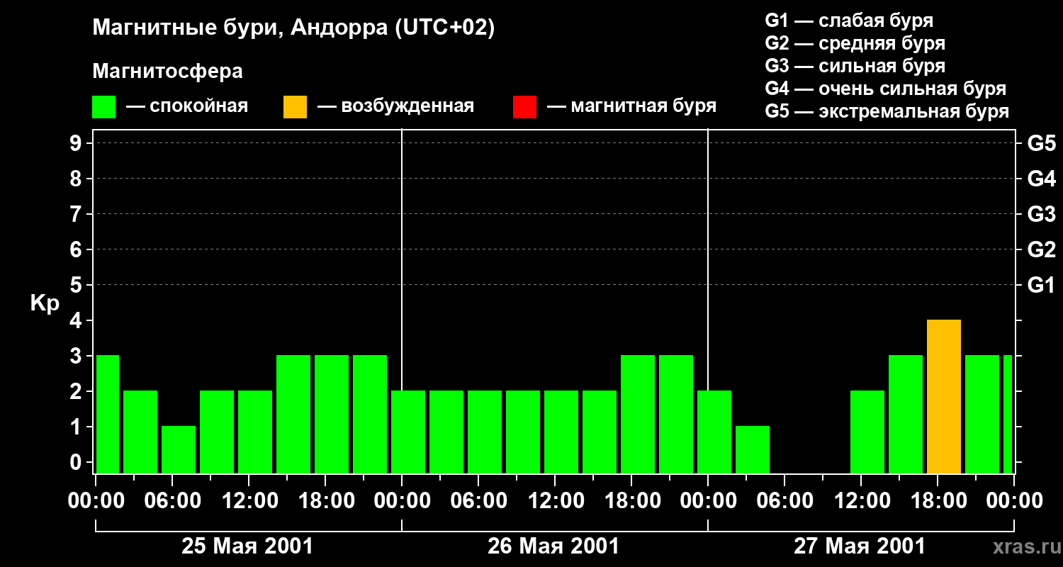 Изменения геомагнитного индекса Kp с 25 по 27 мая 2001 года для средних широт
