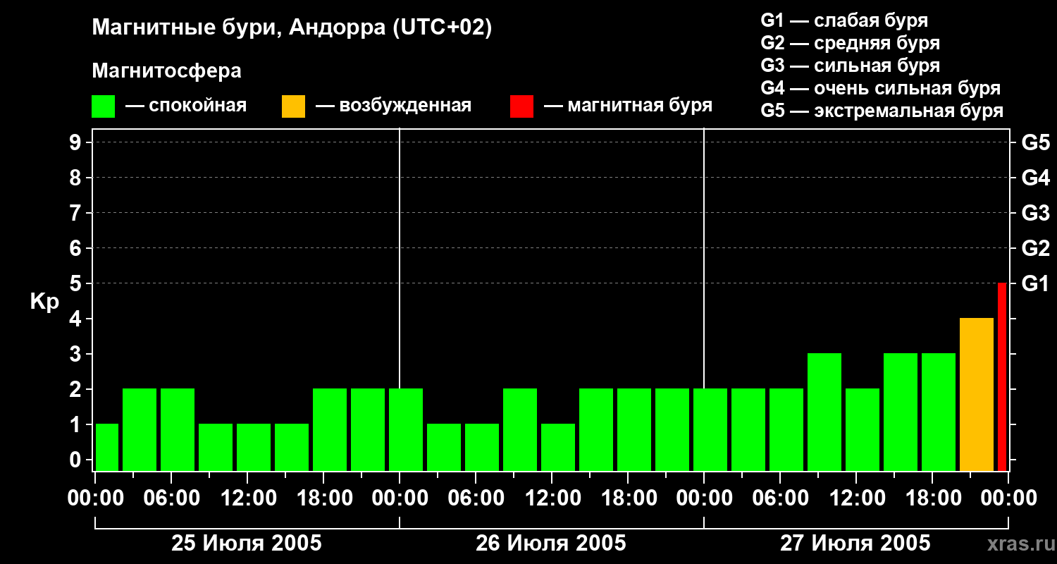Изменения геомагнитного индекса Kp с 25 по 27 июля 2005 года для средних широт