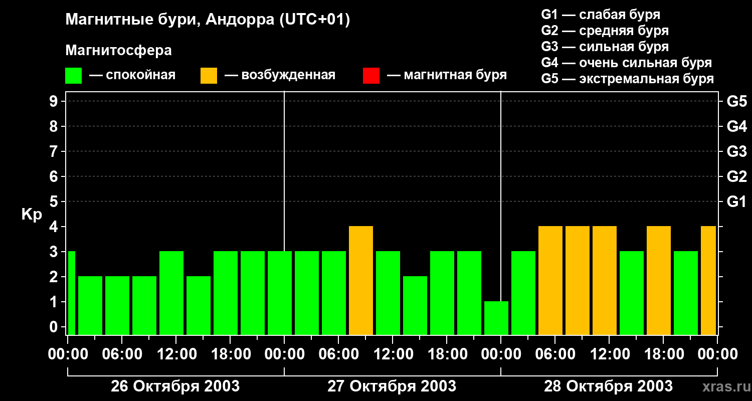 Изменения геомагнитного индекса Kp с 26 по 28 октября 2003 года для средних широт