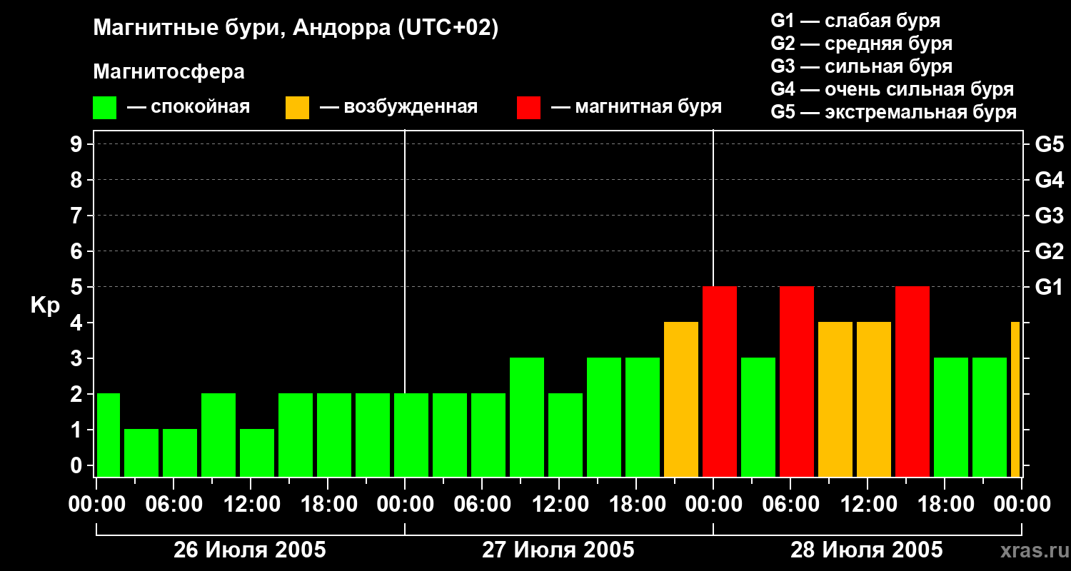 Изменения геомагнитного индекса Kp с 26 по 28 июля 2005 года для средних широт
