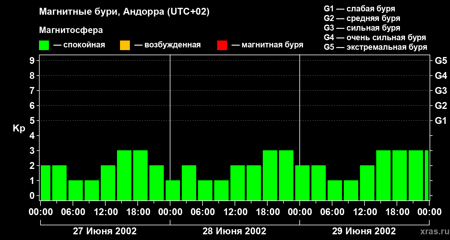 Изменения геомагнитного индекса Kp с 27 по 29 июня 2002 года для средних широт