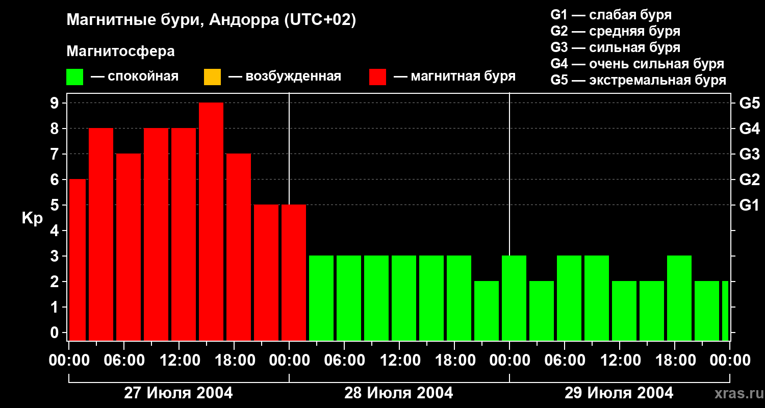 Изменения геомагнитного индекса Kp с 27 по 29 июля 2004 года для средних широт