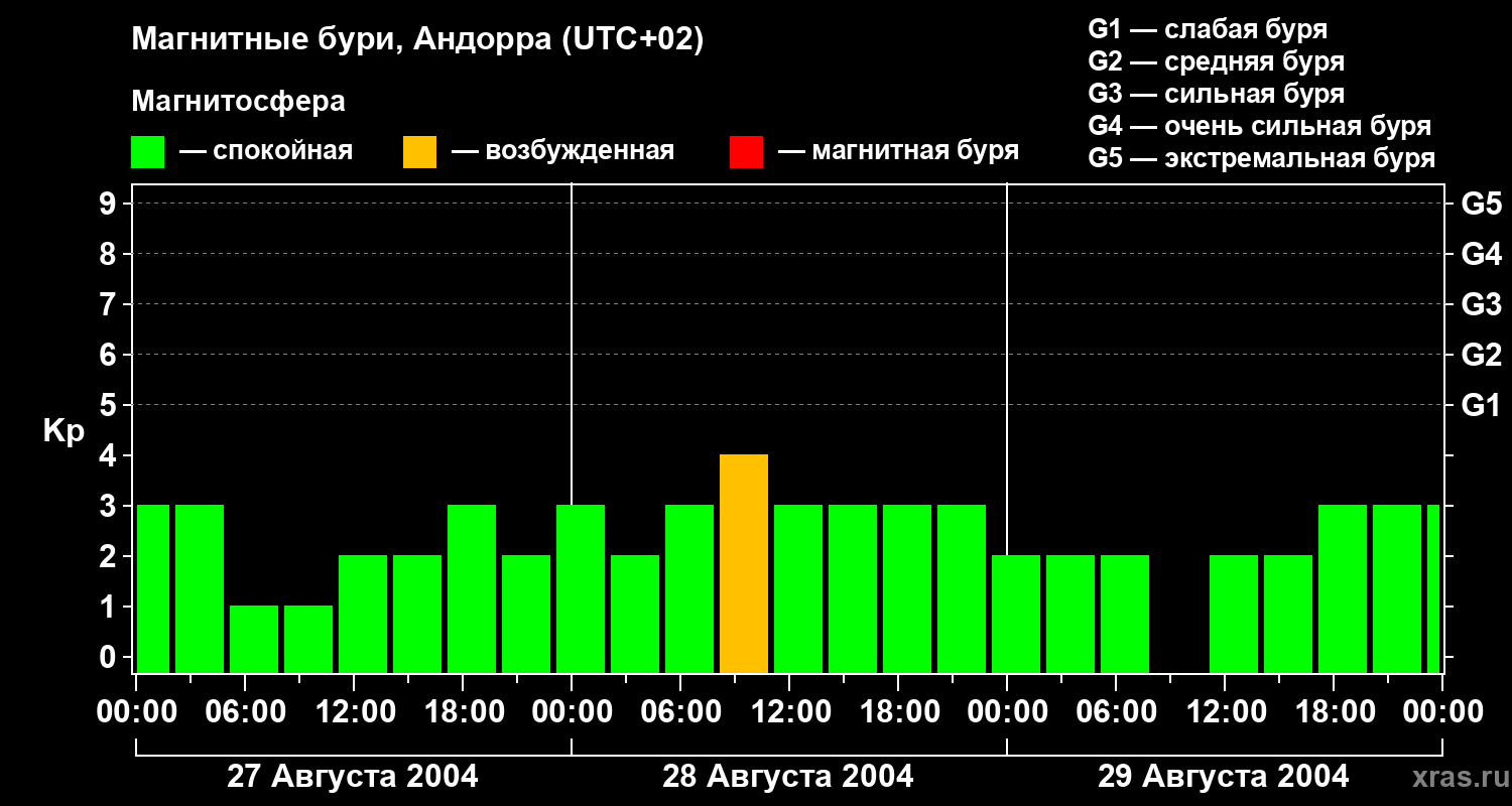 Изменения геомагнитного индекса Kp с 27 по 29 августа 2004 года для средних широт