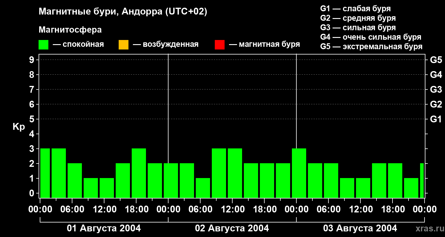 Изменения геомагнитного индекса Kp с 1 по 3 августа 2004 года для средних широт