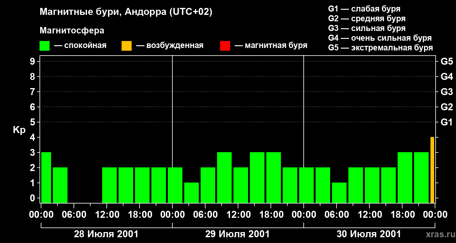 Изменения геомагнитного индекса Kp с 28 по 30 июля 2001 года для средних широт