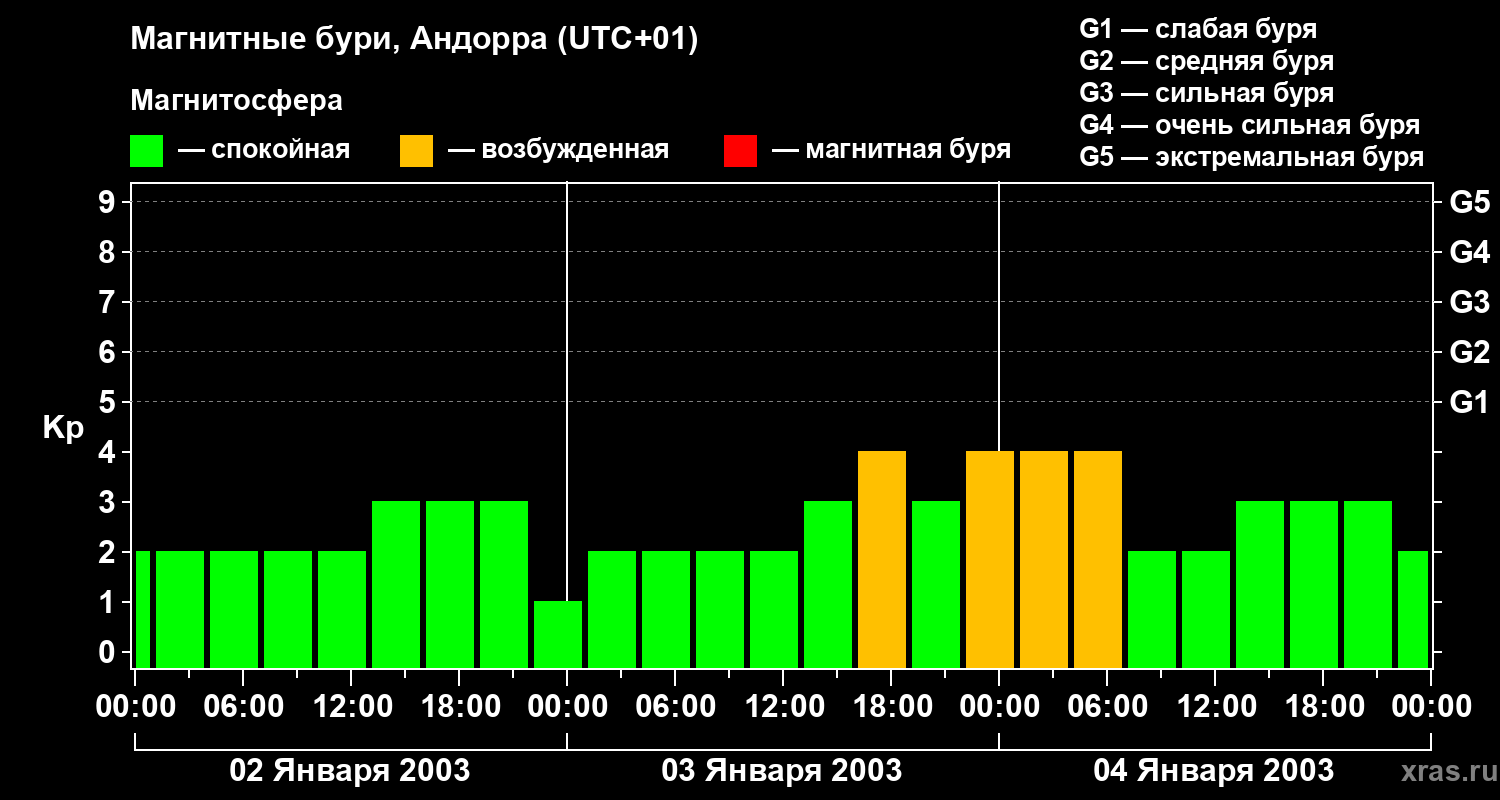 Изменения геомагнитного индекса Kp с 2 по 4 января 2003 года для средних широт