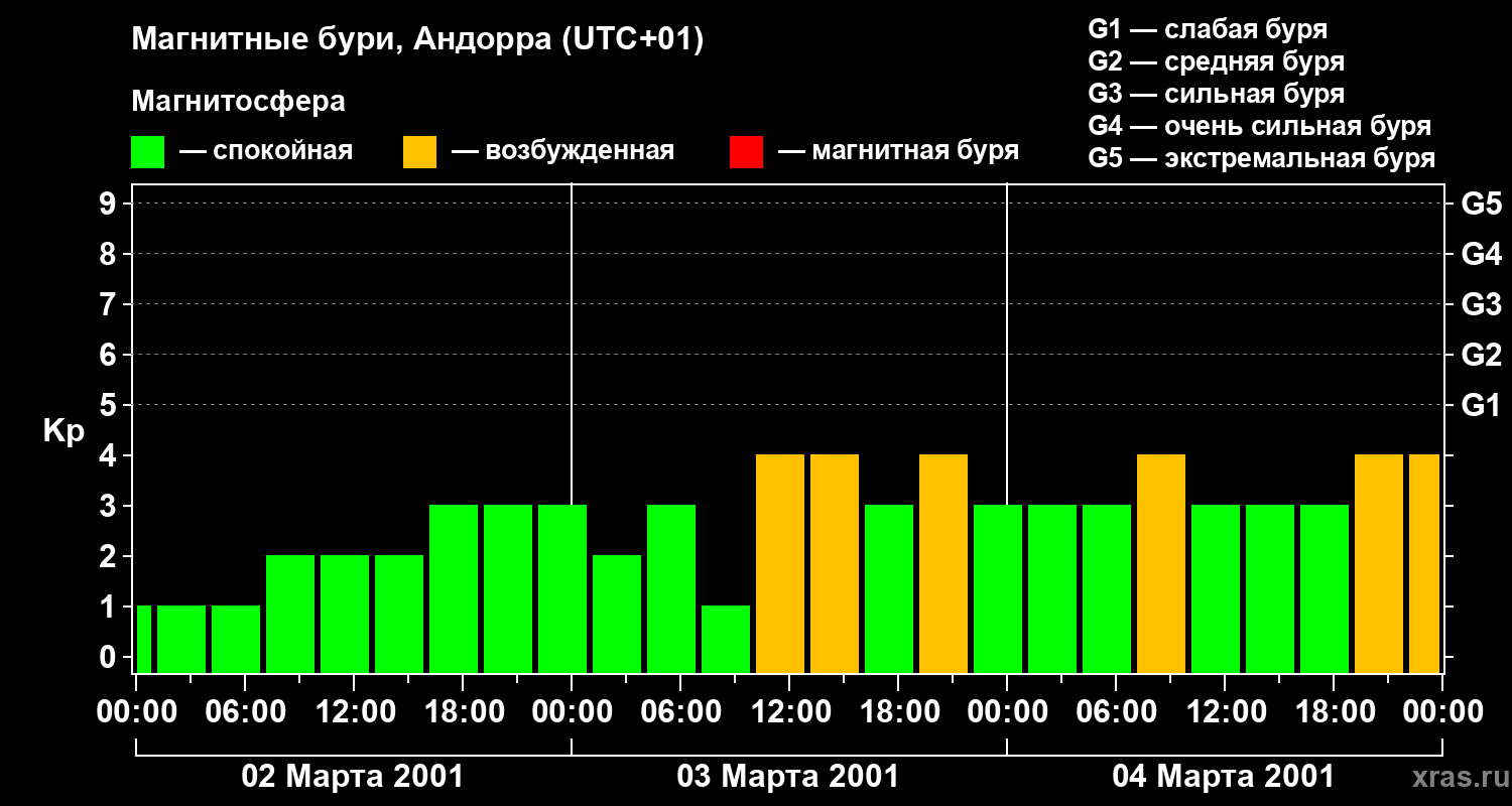 Изменения геомагнитного индекса Kp с 2 по 4 марта 2001 года для средних широт