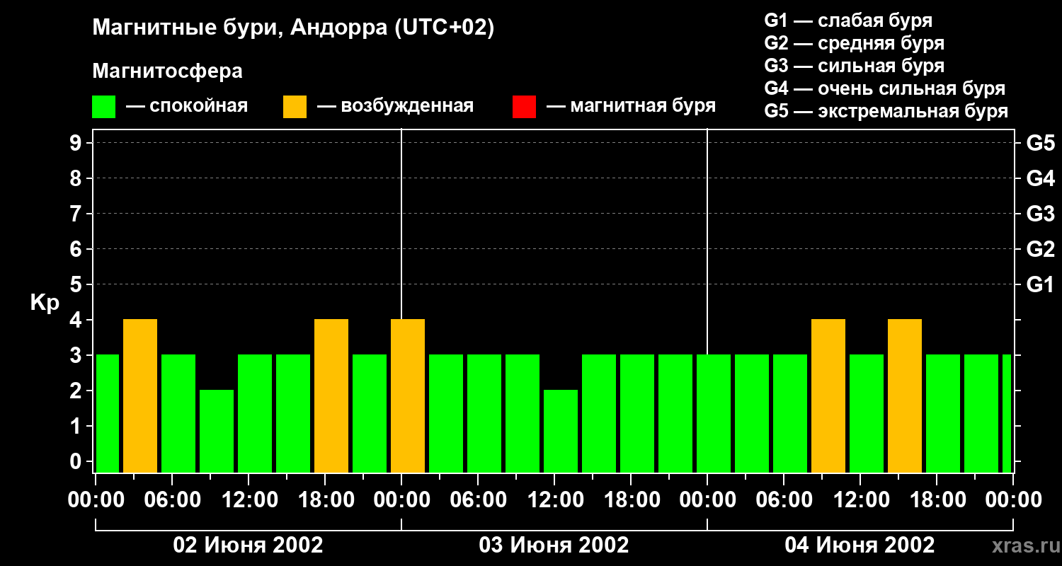 Изменения геомагнитного индекса Kp с 2 по 4 июня 2002 года для средних широт