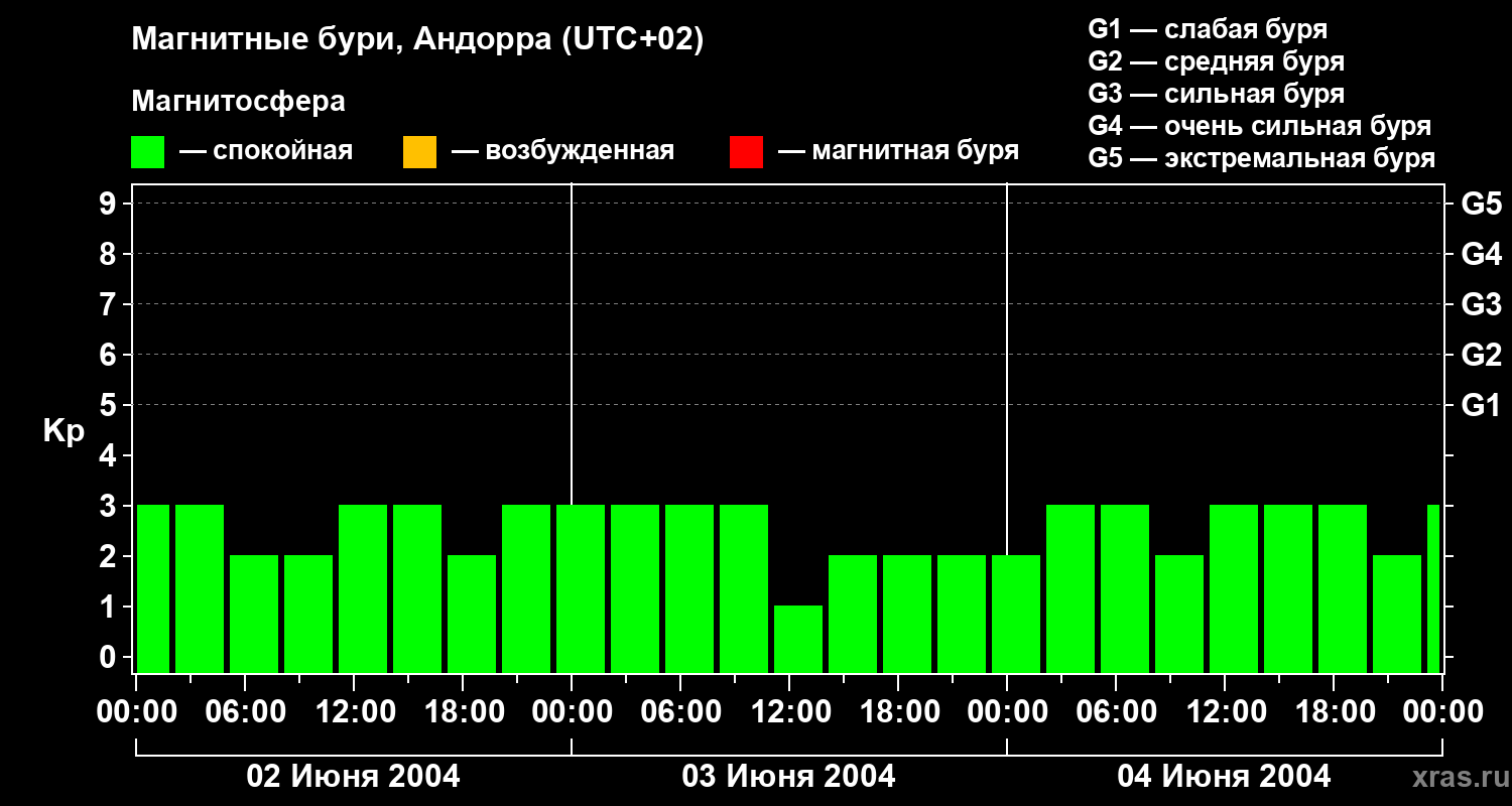Изменения геомагнитного индекса Kp с 2 по 4 июня 2004 года для средних широт