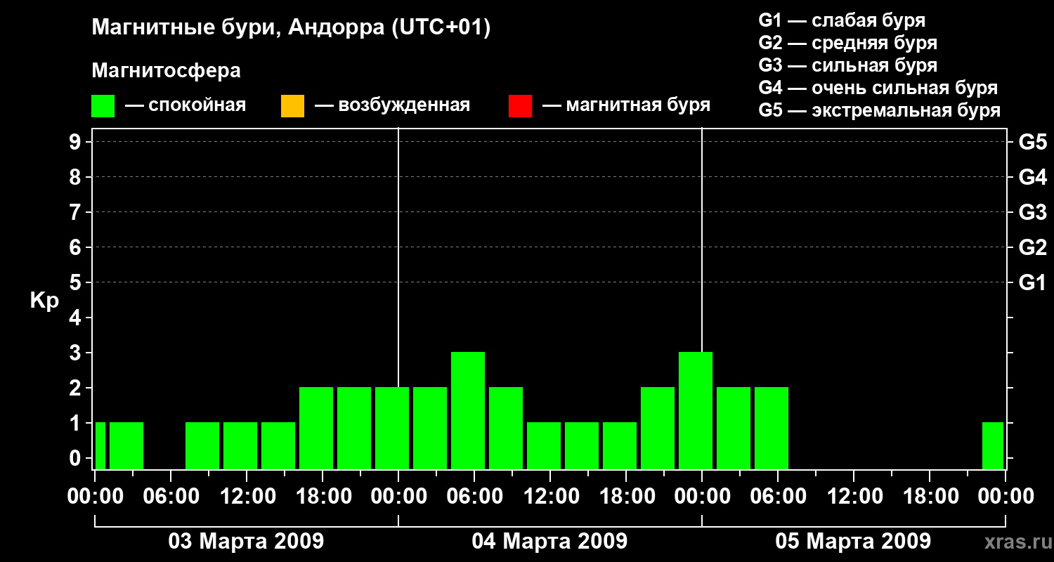 Изменения геомагнитного индекса Kp с 3 по 5 марта 2009 года для средних широт