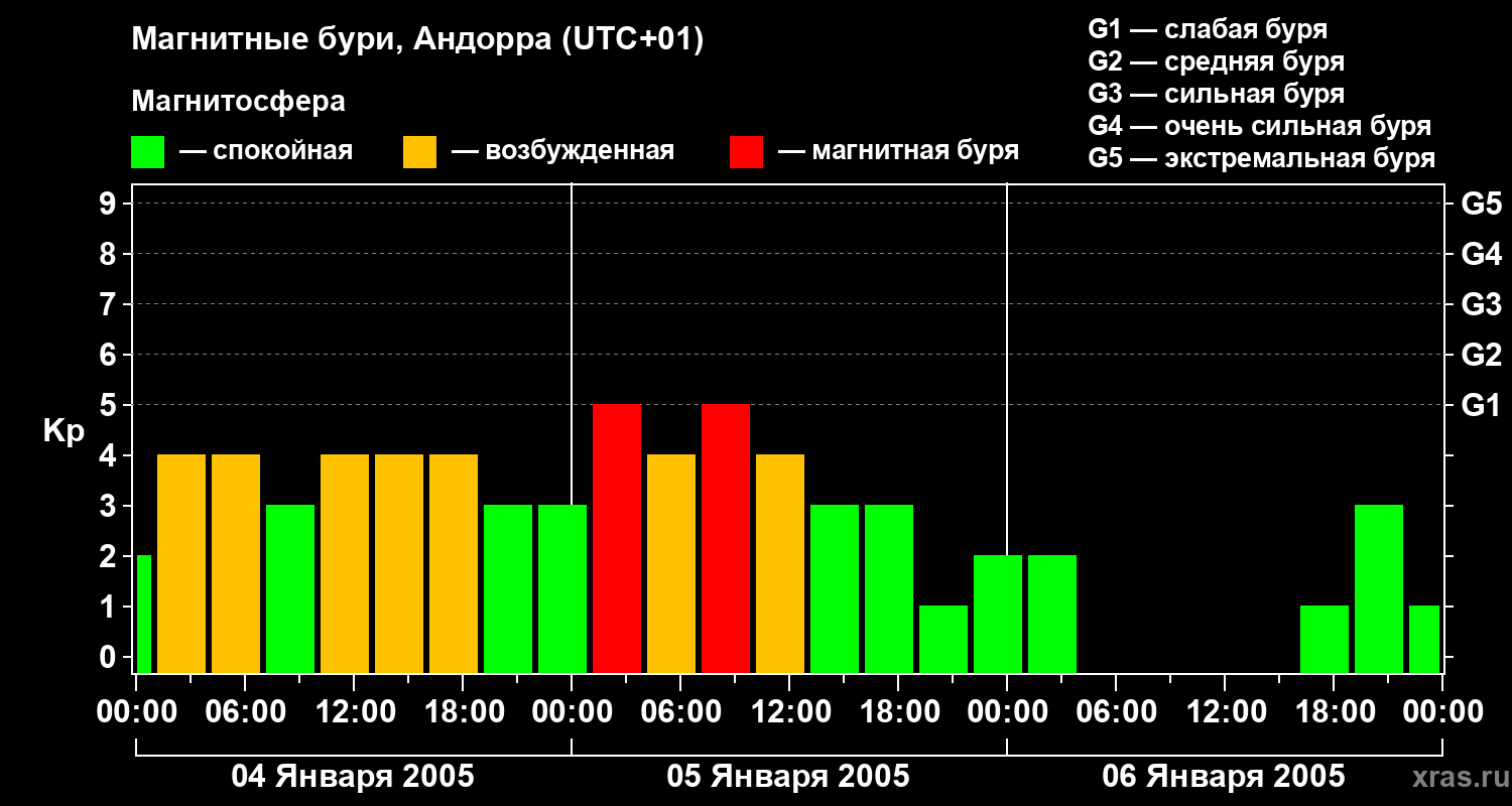 Изменения геомагнитного индекса Kp с 4 по 6 января 2005 года для средних широт