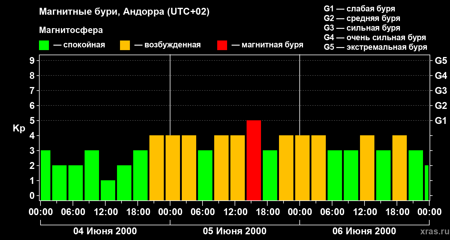Изменения геомагнитного индекса Kp с 4 по 6 июня 2000 года для средних широт