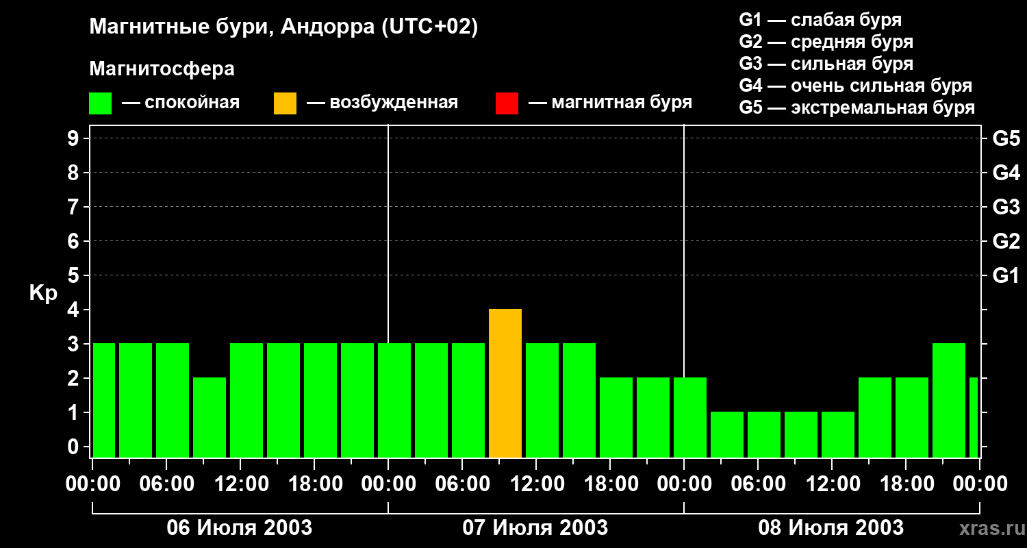 Изменения геомагнитного индекса Kp с 6 по 8 июля 2003 года для средних широт