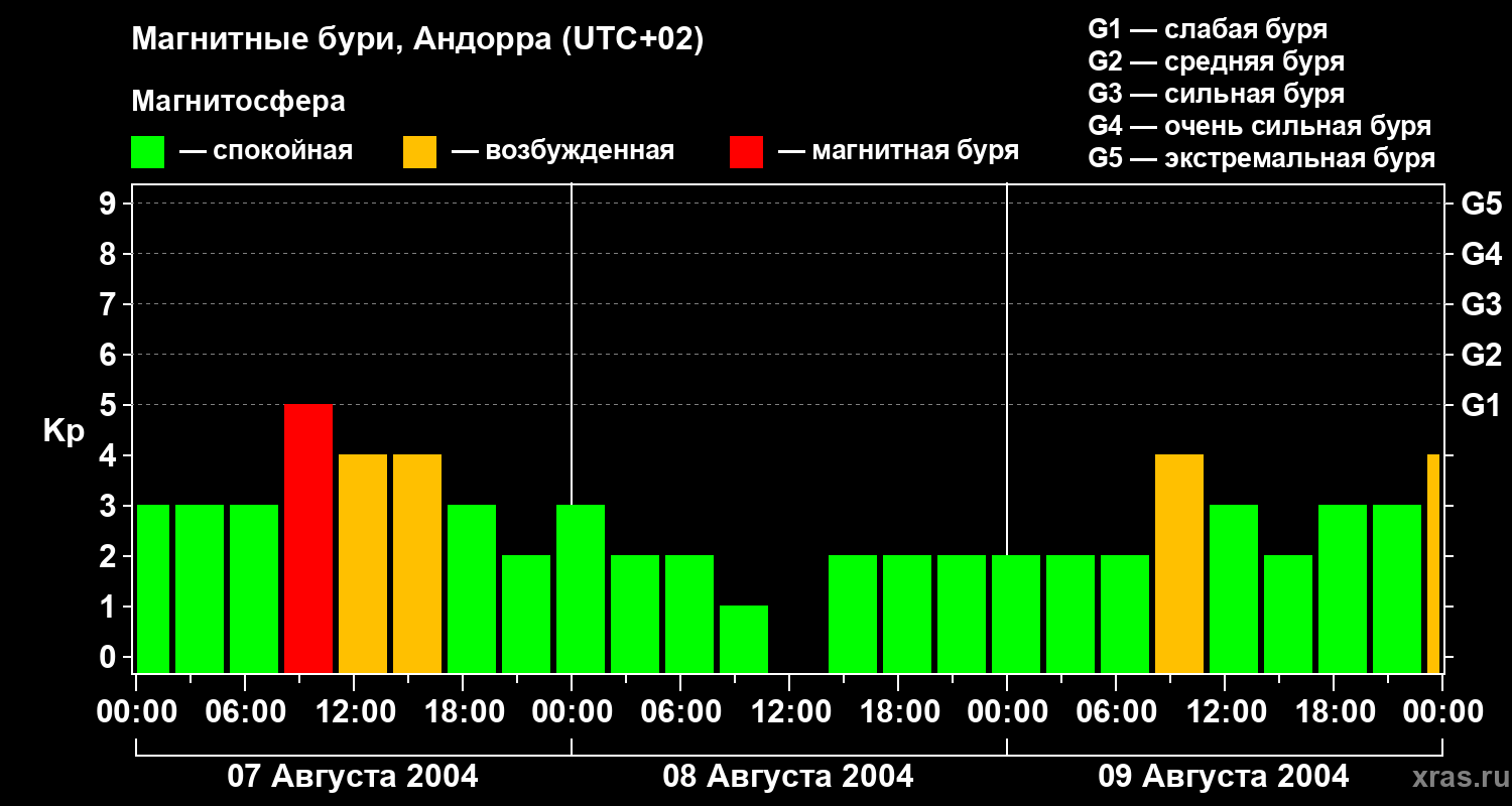 Изменения геомагнитного индекса Kp с 7 по 9 августа 2004 года для средних широт