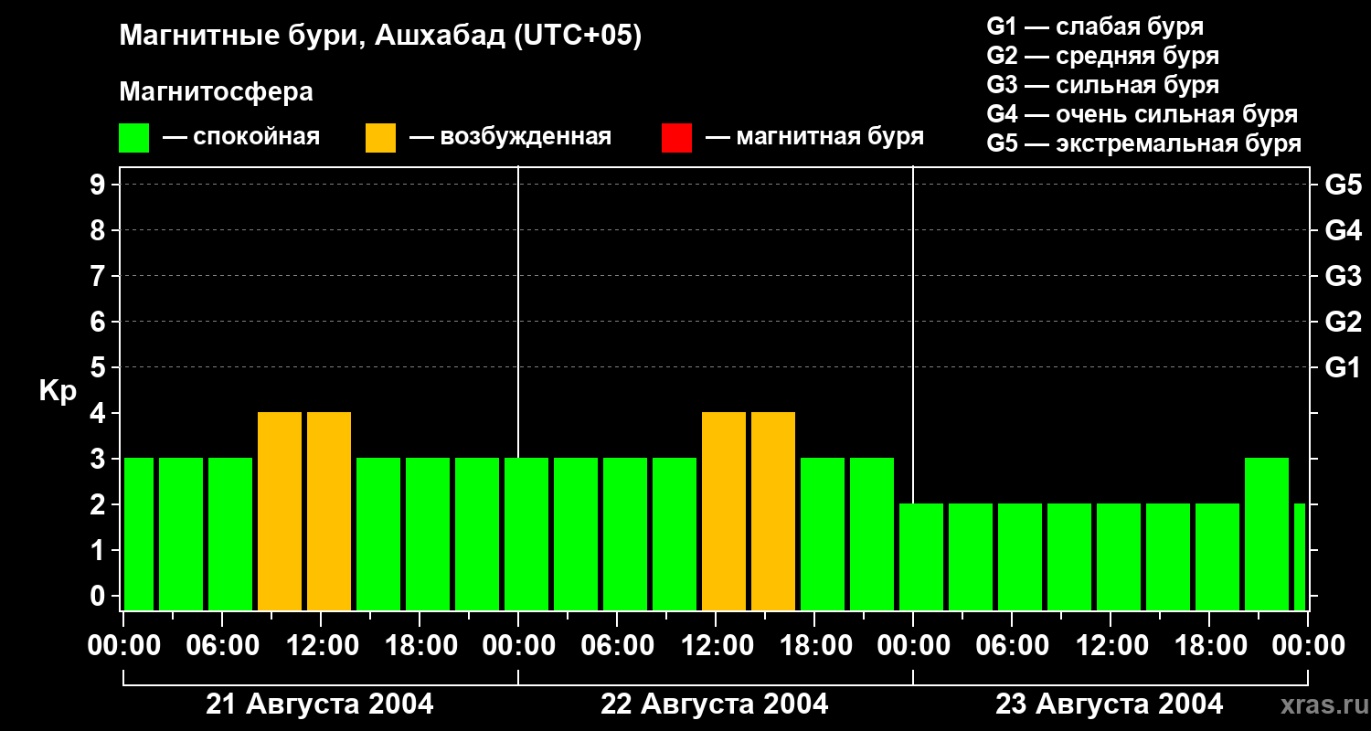 Изменения геомагнитного индекса Kp с 21 по 23 августа 2004 года для средних широт