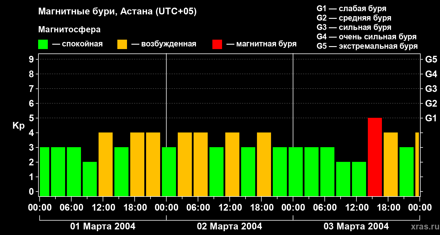 Изменения геомагнитного индекса Kp с 1 по 3 марта 2004 года для средних широт